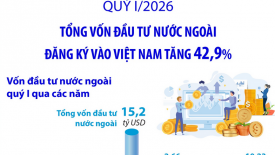 Tổng vốn đầu tư nước ngoài đăng ký vào Việt Nam tăng 42,9% trong quý I/2026Tổng vốn đầu tư nước ngoài đăng ký vào Việt Nam tính đến ngày 31/3/2026 bao gồm: Vốn đăng ký cấp mới, vốn đăng ký điều chỉnh và giá trị góp vốn, mua cổ phần của nhà đầu tư nước ngoài đạt 15,20 tỷ USD, tăng 42,9% so với cùng kỳ năm trước. -
