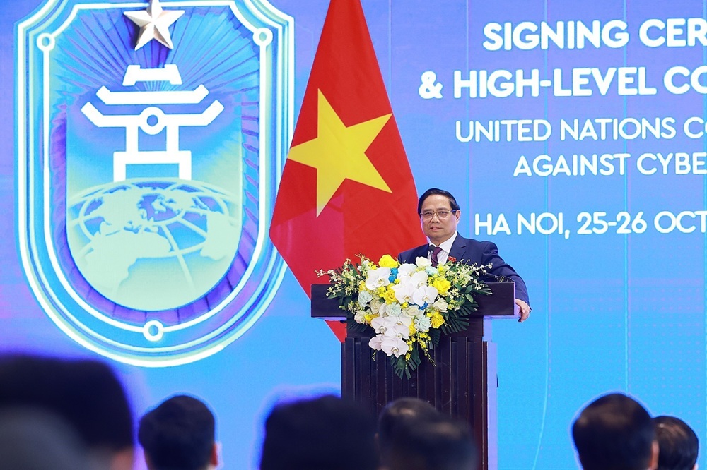 Cho biết Việt Nam kiên trì đường lối đối ngoại độc lập, tự chủ, đa dạng hóa, đa phương hóa, là bạn tốt, đối tác tin cậy, thành viên có trách nhiệm của cộng đồng quốc tế, vì hòa bình, hợp tác, ổn định và phát triển, Thủ tướng trân trọng cảm ơn Liên hợp quốc đã tin tưởng trao cho Việt Nam vinh dự và trách nhiệm thực hiện sứ mệnh tổ chức Lễ mở ký Công ước về chống tội phạm mạng.