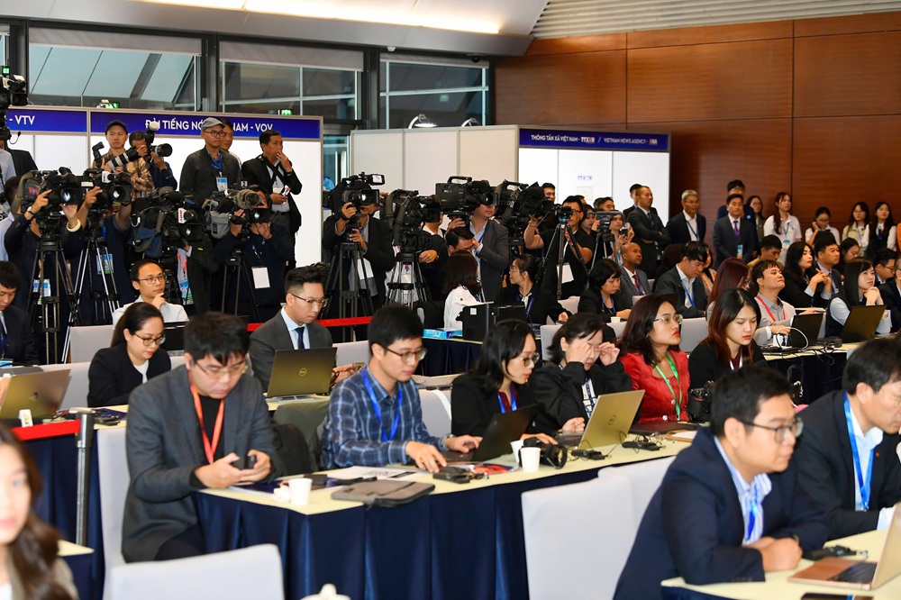 | Đông đảo phóng viên các cơ quan thông tấn báo chí trong và ngoài nước tham dự buổi họp báo. |