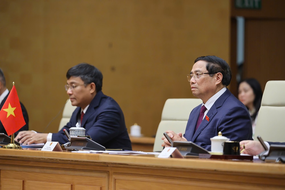 Thủ tướng Phạm Minh Chính (bên phải) đón đoàn tại trụ sở Chính phủ. |