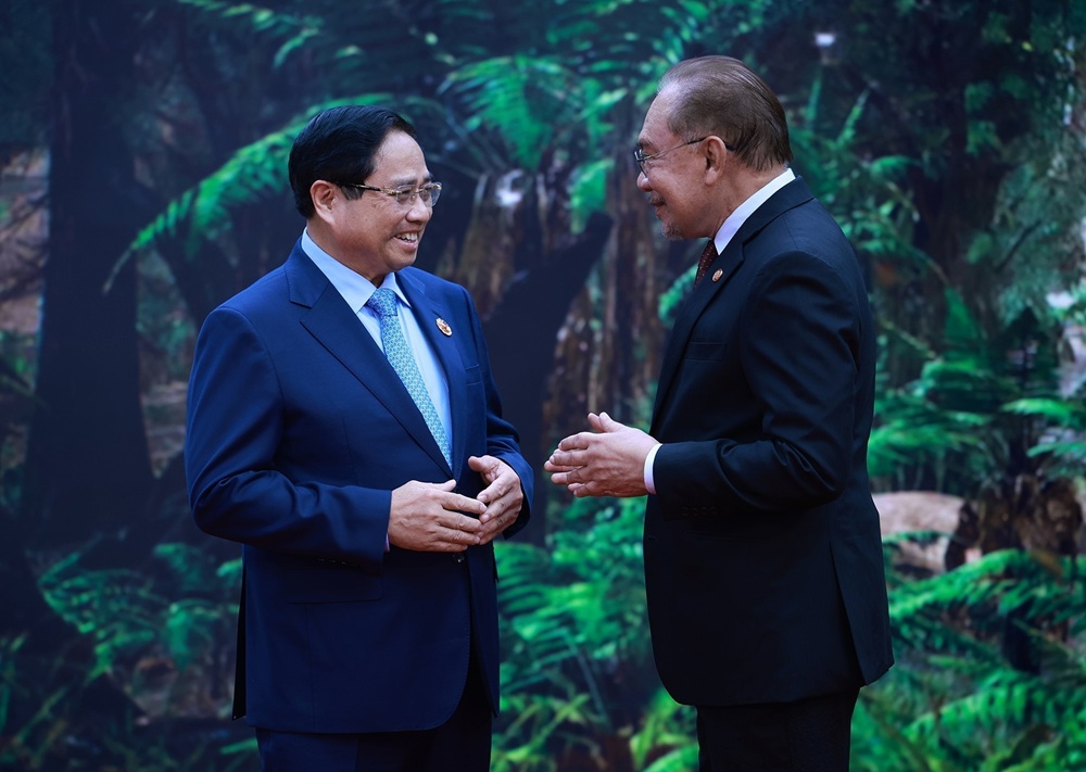 Thủ tướng Malaysia Anwar Ibrahim, Chủ tịch ASEAN 2025 trao đổi với Thủ tướng Phạm Minh Chính. Ảnh: Dương Giang-TTXVN |