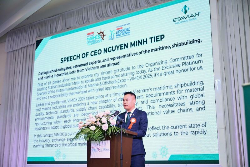 “Việt Nam đang đứng trước cơ hội quan trọng để nâng cấp năng lực công nghiệp biển và hội nhập sâu hơn vào chuỗi cung ứng quốc tế. Với vai trò Nhà tài trợ Bạch kim độc quyền của VIMOX 2025, Stavian Industrial Metal cam kết đóng góp thiết thực thông qua hệ giải pháp toàn diện cho ngành kim loại công nghiệp, tiên phong cung cấp vật liệu xanh và đồng hành cùng doanh nghiệp trong nâng cao năng lực cạnh tranh”, ông Nguyễn Minh Tiệp, Tổng giám đốc Stavian Industrial Metal chia sẻ.