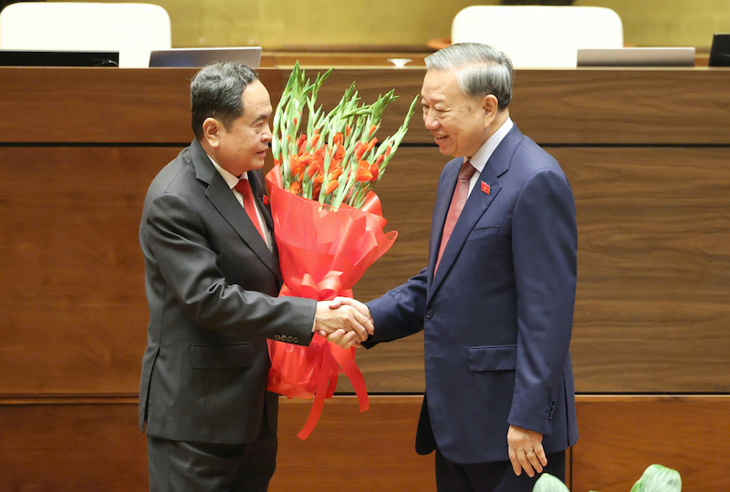 | Tổng Bí thư Tô Lâm tặng hoa chúc mừng Chủ tịch Quốc hội Trần Thanh Mẫn. |