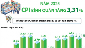 CPI bình quân năm 2025 tăng 3,31%CPI bình quân năm 2025 tăng 3,3% so với năm 2024, đạt mục tiêu Quốc hội đề ra. -