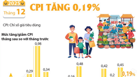 CPI tháng 12/2025 tăng 0,19%Chỉ số giá tiêu dùng (CPI) tháng 12/2025 tăng 0,19% so với tháng trước. Có 9 nhóm hàng hóa và dịch vụ có chỉ số giá tăng và 2 nhóm hàng hóa và dịch vụ có chỉ số giá giảm. -