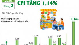 CPI tháng 2/2026 tăng 1,14%Chỉ số giá tiêu dùng (CPI) tháng 2/2026 tăng 1,14% so với tháng trước. Nguyên nhân chính là do giá thực phẩm, ăn uống ngoài gia đình và dịch vụ giao thông tăng do nhu cầu mua sắm, đi lại của người dân tăng trong dịp Tết Nguyên đán Bính Ngọ. Trong mức tăng 1,14% của CPI tháng 2/2026 so với tháng trước các nhóm hàng hóa và dịch vụ tiêu dùng chính đều tăng giá. -