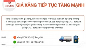 Giá xăng tiếp tục tăng mạnhTrong lần điều điều hành lúc 15h ngày 7/3/2026 của Liên Bộ Công thương - Tài chính, giá xăng dầu tiếp tục tăng mạnh, giá bán lẻ đối với xăng RON 95-III là 27.047 đồng/lít (tăng 4.707 đồng/lít so với giá cơ sở kỳ trước). Giá xăng E5 RON 92 không cao hơn 25.226 đồng/lít (tăng 3.777 đồng/lít so với giá cơ sở kỳ trước). -