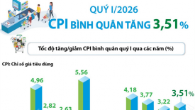 CPI quý I/2026 tăng 3,51%Chỉ số giá tiêu dùng bình quân quý I/2026 tăng 3,51% so với cùng kỳ năm 2025, trong đó: Nhà ở, điện nước, chất đốt và vật liệu xây dựng tăng 5,69%; hàng ăn và dịch vụ ăn uống tăng 4,55%; hàng hóa và dịch vụ khác tăng 3,68%; giáo dục tăng 3,21%... -