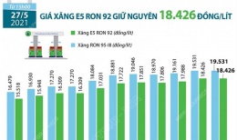 [Infographic] Giá xăng E5 RON 92 vừa tăng 438 đồng/lítTừ 15h ngày 12/5/2021, giá xăng E5 RON 92 tăng 438 đồng/lít (tương đương 2,43%) lên 18.426 đồng/lít, giá xăng RON 95-III tăng 370 đồng/lít (tương đương 1,93%) lên 19.531 đồng/lít.