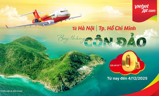 Chào mừng các chuyến bay kết nối Hà Nội, TP.HCM - Côn Đảo được Vietjet khai thác trở lại từ 3/12/2025, Vietjet dành tặng khách hàng ưu đãi “3 ngày vàng” hấp dẫn với vé 0 đồng (chưa bao gồm thuế, phí) áp dụng từ nay đến 4/12/2025.