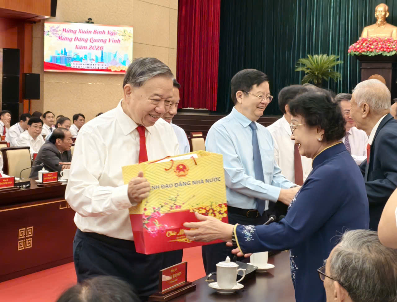 Trong không khí vui tươi, phấn khởi đón chào xuân mới, khi Tết Nguyên đán Bính Ngọ năm 2026 đang đến gần, Tổng Bí thư Tô Lâm ân cần thăm hỏi và trao phần quà Tết gửi tặng Đảng bộ TP.HCM, các Mẹ Việt Nam anh hùng, cán bộ cao cấp nghỉ hưu trên địa bàn, người có công, gia đình chính sách tiêu biểu.