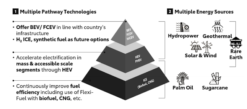 Chiến lược này bao gồm đầy đủ các hệ truyền động - từ xe hybrid dùng nhiên liệu linh hoạt (flex-fuel) tại Nam Mỹ, xe hybrid cỡ nhỏ tại châu Á, cho đến các dòng sedan sử dụng pin nhiên liệu (fuel cell) mới tại Nhật Bản.