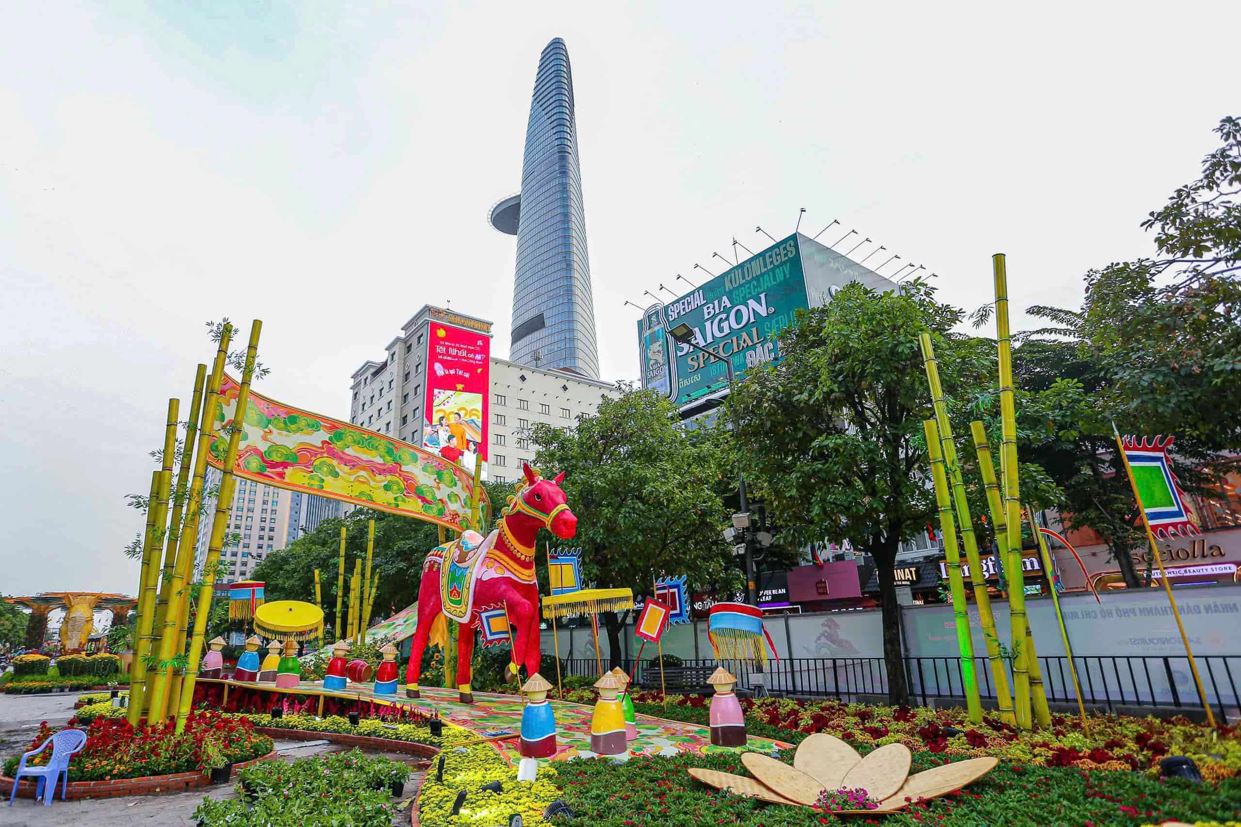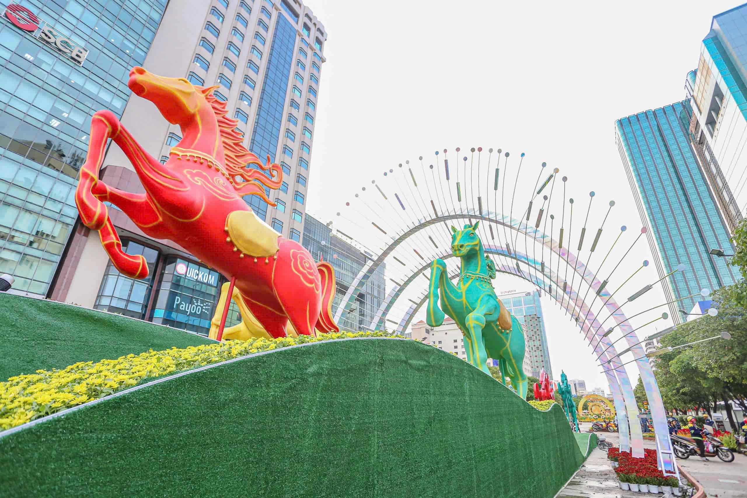 Ngay tại cổng chào hướng giao lộ Nguyễn Huệ - Tôn Đức Thắng, du khách sẽ ấn tượng với bộ ba chú ngựa mang sắc màu xanh, đỏ và vàng đặc trưng của ngày Tết. |
