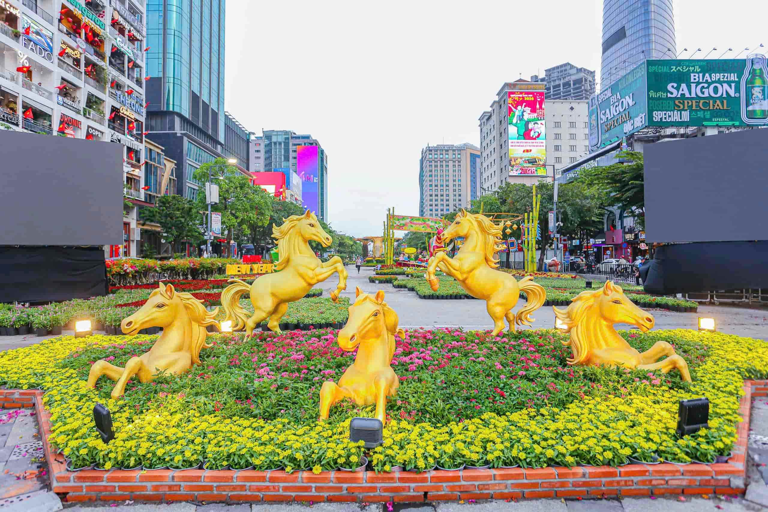 | Suốt đường hoa còn có đại cảnh như “Nhất mã thong dong” là chú ngựa khổng lồ nhởn nhơ gặm cỏ, “Ngựa 9 hồng mao” lấy cảm hứng từ truyền thuyết Sơn Tinh - Thủy Tinh, đại cảnh “Lý ngựa ô” tái hiện nét văn hóa Nam Bộ. Ngoài ra, đại cảnh “Giang sơn cẩm tú” quy tụ 9 ngựa vĩnh cửu phi nước đại, trong đó 3 ngựa chính biểu trưng cho TP.HCM, Vũng Tàu và Bình Dương với tạo hình nguyên khối thể hiện sự mạnh mẽ và vững chãi. |