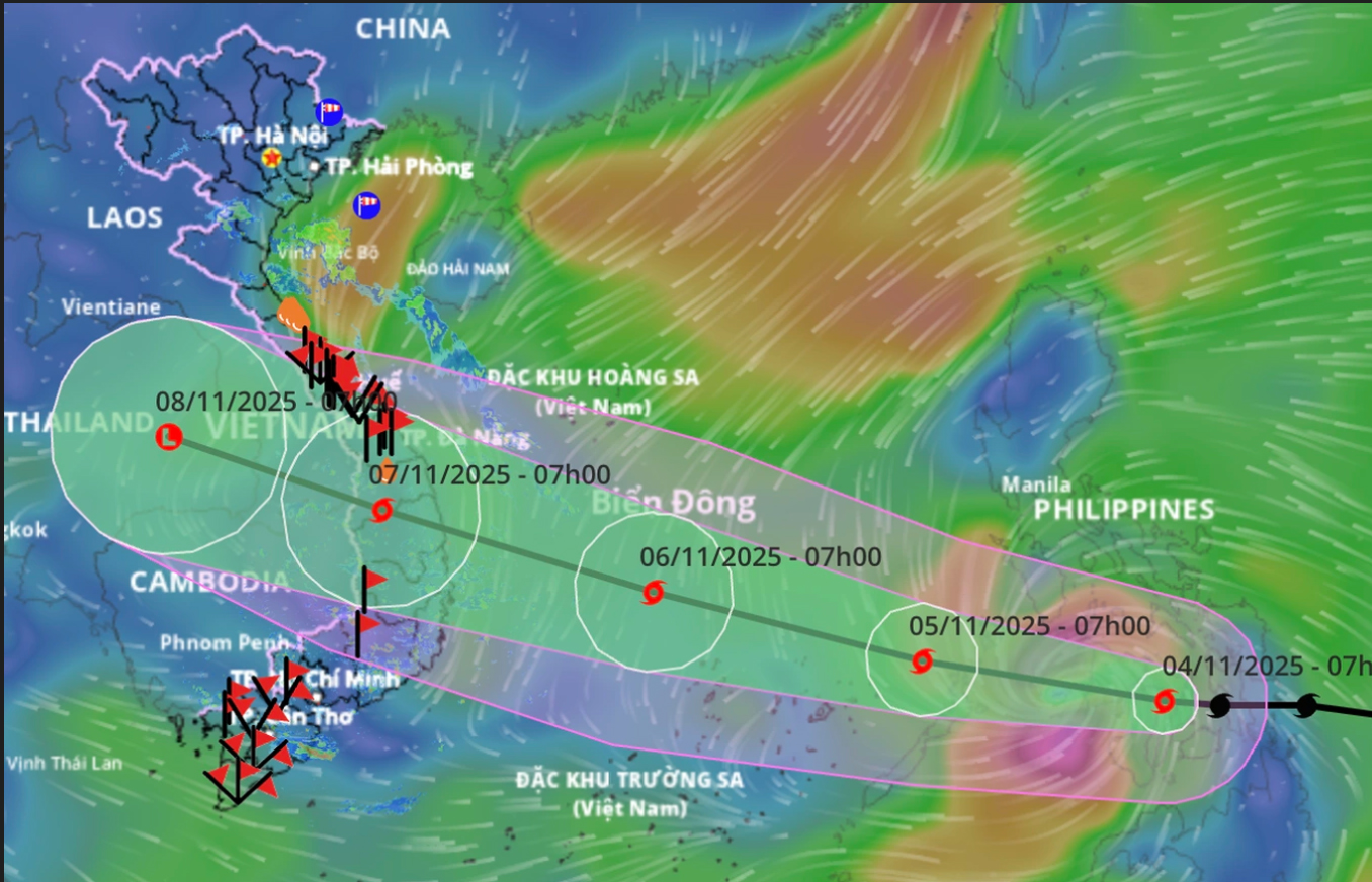 | Hướng di chuyển của bão Kalmaegi (Ảnh: Hệ thống giám sát thiên tai Việt Nam). |