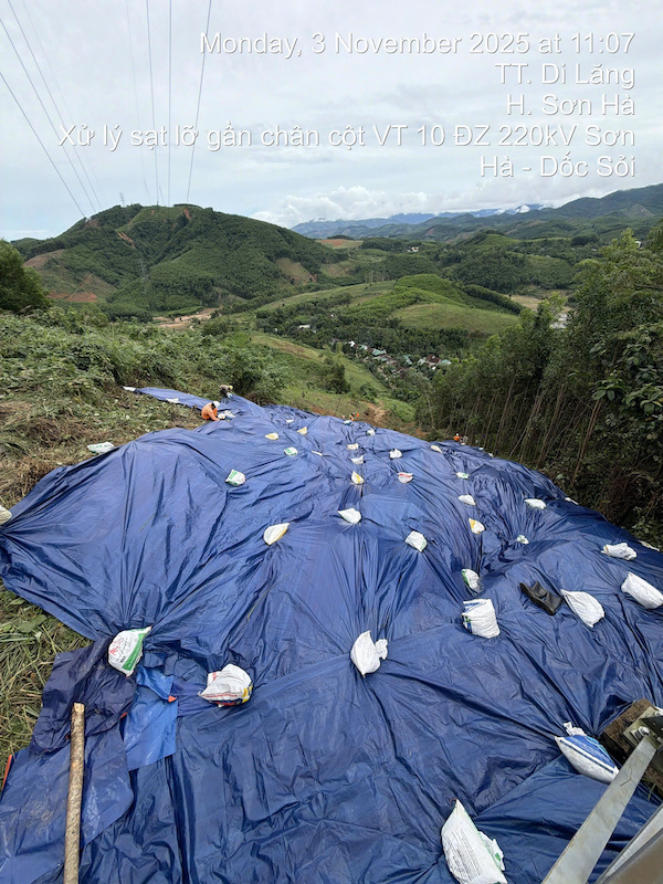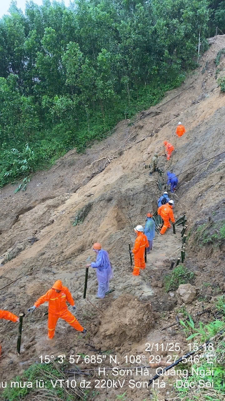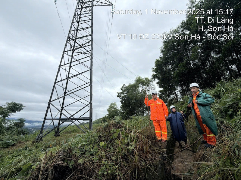Cũng sau đợt mưa lớn kéo dài, Tổ quản lý vận hành đường dây Sơn Hà khi tuần tra, kiểm tra đã phát hiện tại vị trí 10 đường dây 220 kV Dốc Sỏi - Sơn Hà, thuộc địa bàn thôn Cà Đáo, xã Sơn Hà, tỉnh Quảng Ngãi bị sạt lở chân móng. Điểm sạt lở cách kè móng VT 10 Đường dây 220 kV Dốc Sỏi – Sơn Hà khoảng 14 mét, chiều dài điểm sạt lở 120 mét, chiều rộng điểm sạt lở đoạn lớn nhất 40 mét, hẹp nhất 20 mét.