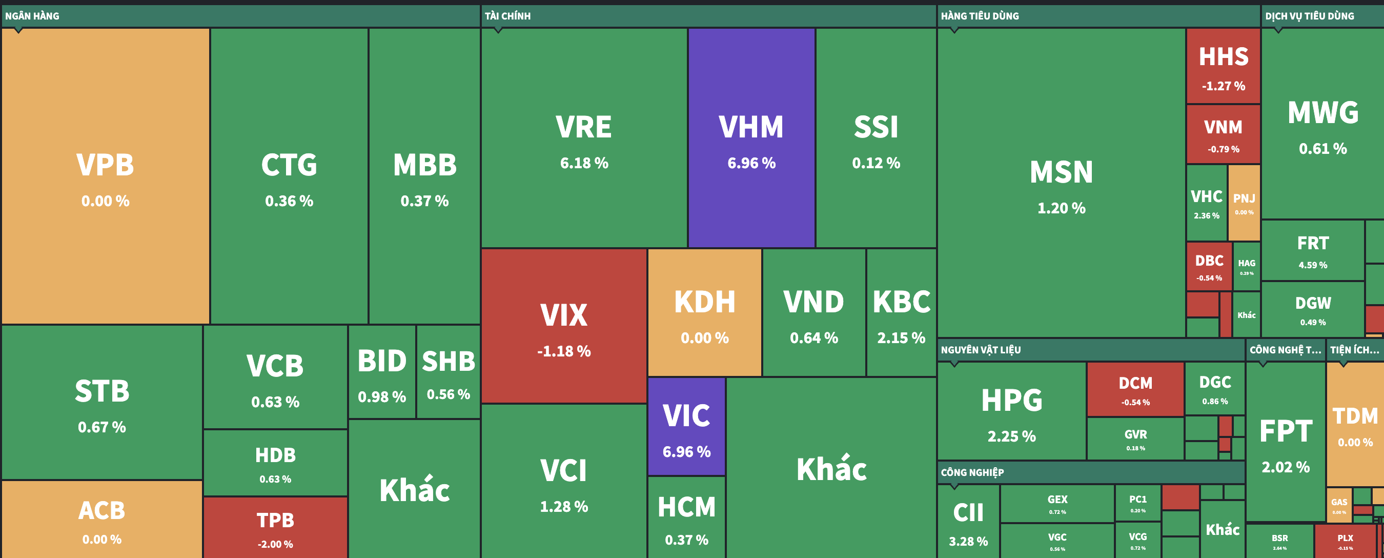 Nhờ đó, cả hai mã VIC và VHM đều đồng loạt kéo chỉ số vào ngay những phút cuối cùng trước khi đóng cửa. Riêng hai mã này đã đóng góp gần 15 điểm cho VN-Index.
