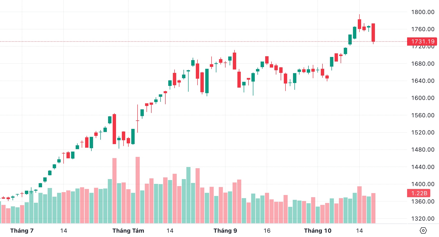 Một phiên điều chỉnh mạnh diễn ra hôm nay (17/10) với khả năng chốt lời cao từ nhóm cổ phiếu đã tăng mạnh thời gian qua, khiến VN-Index giảm 35,66 điểm, lùi về 1.731,19 điểm.