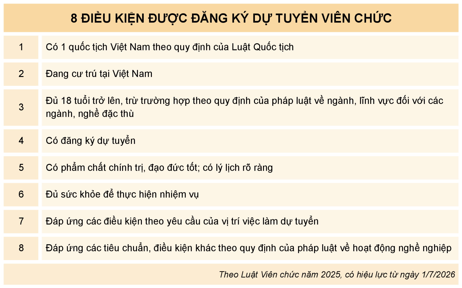 Về năng lực thực thi nhiệm vụ, người dự tuyển phải đủ sức khỏe để đảm nhận công việc theo vị trí việc làm đăng ký. Đồng thời, ứng viên phải đáp ứng đầy đủ các điều kiện cụ thể theo yêu cầu của vị trí việc làm, từ trình độ chuyên môn, kỹ năng đến kinh nghiệm, nếu có.