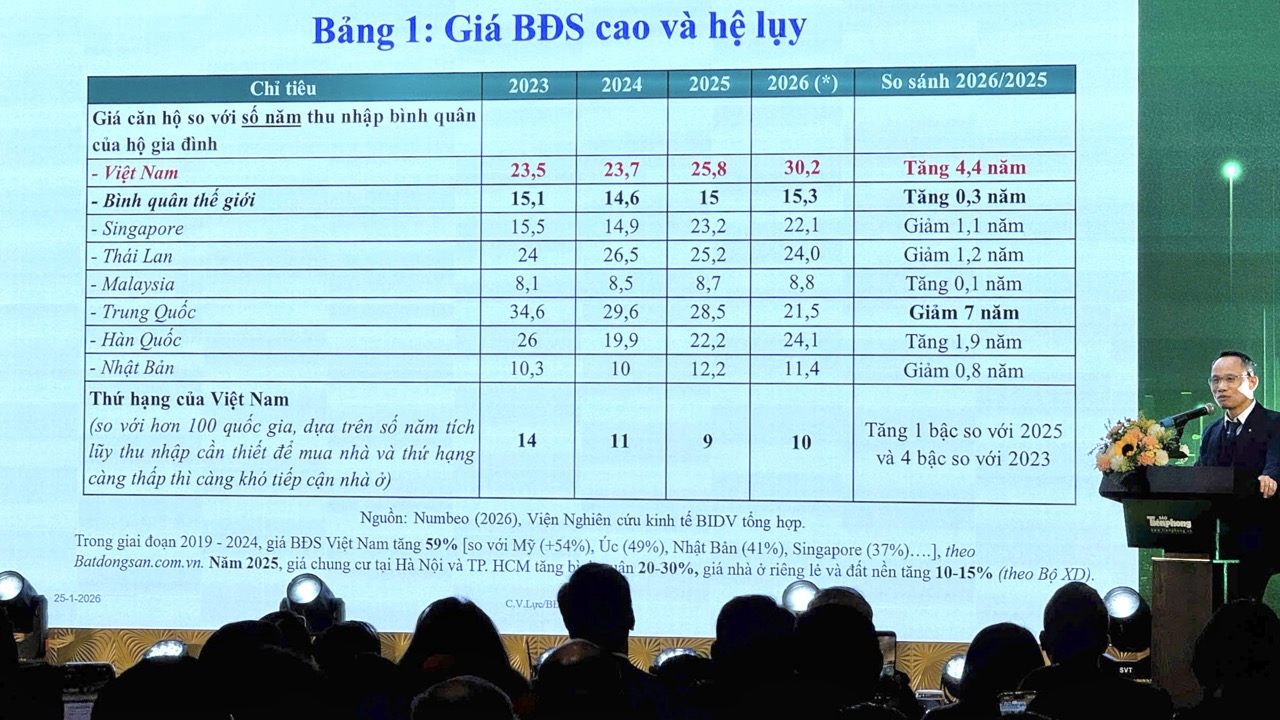 “Nếu trong năm 2025, một hộ gia đình cần trung bình khoảng 26 năm thu nhập để mua được một căn hộ thì sang năm 2026, con số này đã tăng lên 30 năm - cao gấp đôi mức bình quân của thế giới. Trong khi đó, tại Trung Quốc, số năm tích lũy thu nhập để mua nhà đã giảm 7 năm, xuống còn 21 năm”, TS. Cấn Văn Lực cho biết.
