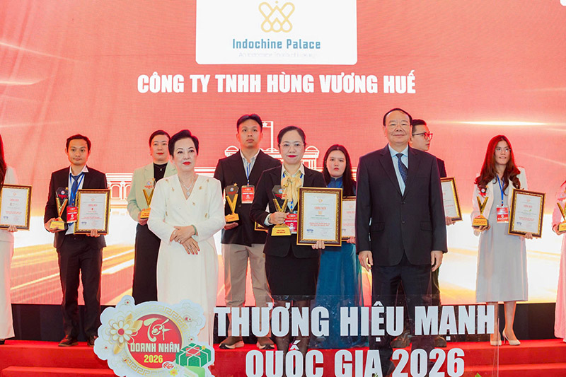 Bà Nguyễn Thị Thu Phương đại diện Công ty TNHH Hùng Vương Huế lên nhận giải Top 10 Thương hiệu mạnh Quốc gia 2026. Ảnh: Văn Phú |
