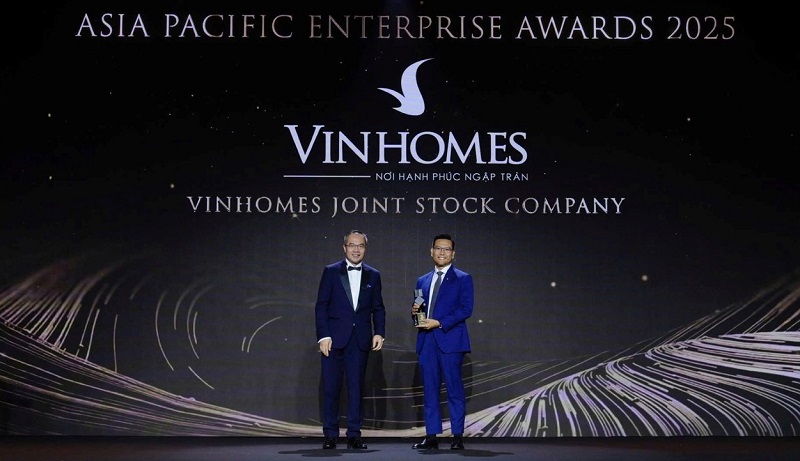 | Đại diện Vinhomes (bên phải) nhận giải Doanh nghiệp Xuất sắc châu Á, trong khuôn khổ giải thưởng Asia Pacific Enterprise Awards 2025 |