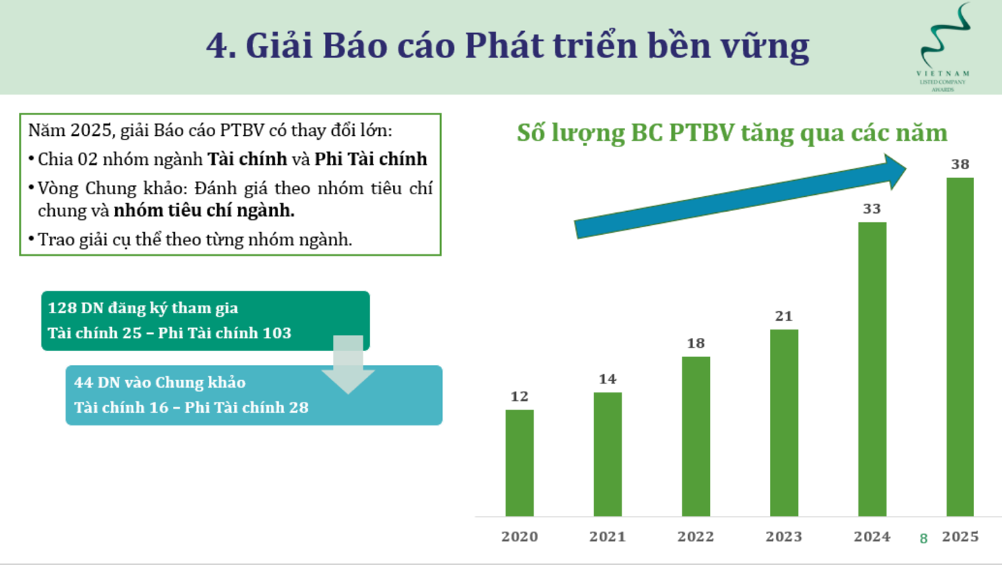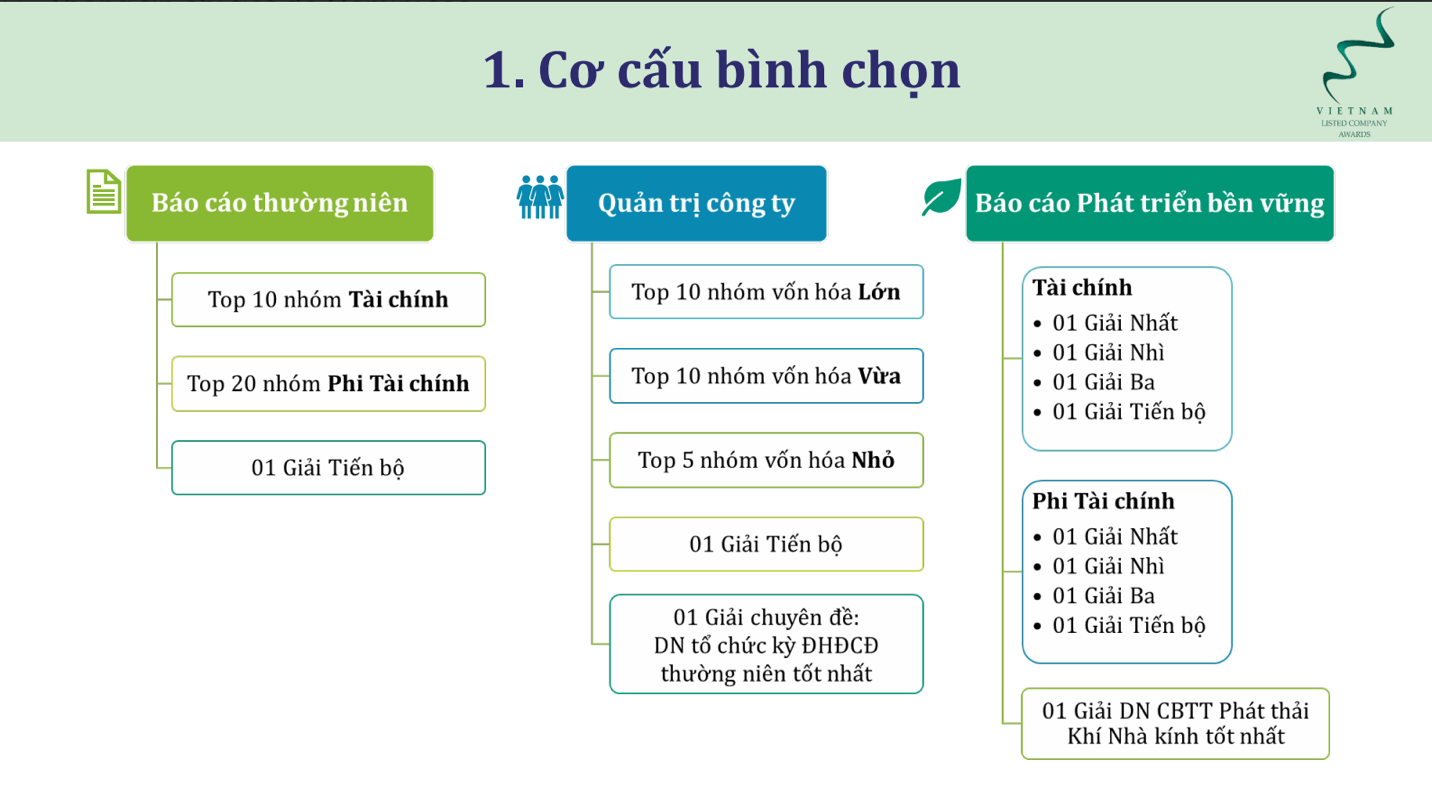 VLCA 2025 tiếp tục được tổ chức với ba hạng mục bình chọn chính: Báo cáo Thường niên, Quản trị Công ty, và Báo cáo Phát triển Bền vững.