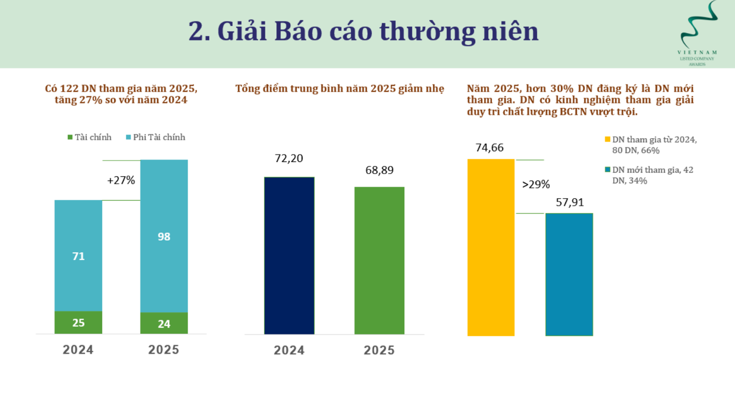 Đối với Hạng mục Báo cáo Thường niên có cơ cấu giải gồm top 10 nhóm tài chính, top 20 nhóm phi tài chính và một giải nhất. Năm nay có 122 doanh nghiệp đăng ký tham gia. Điểm trung bình của năm 2025 chỉ khoảng 69 điểm, thấp hơn so với năm 2024. Điểm thấp này chủ yếu do các doanh nghiệp mới tham gia có điểm thấp hơn, kéo điểm trung bình xuống.