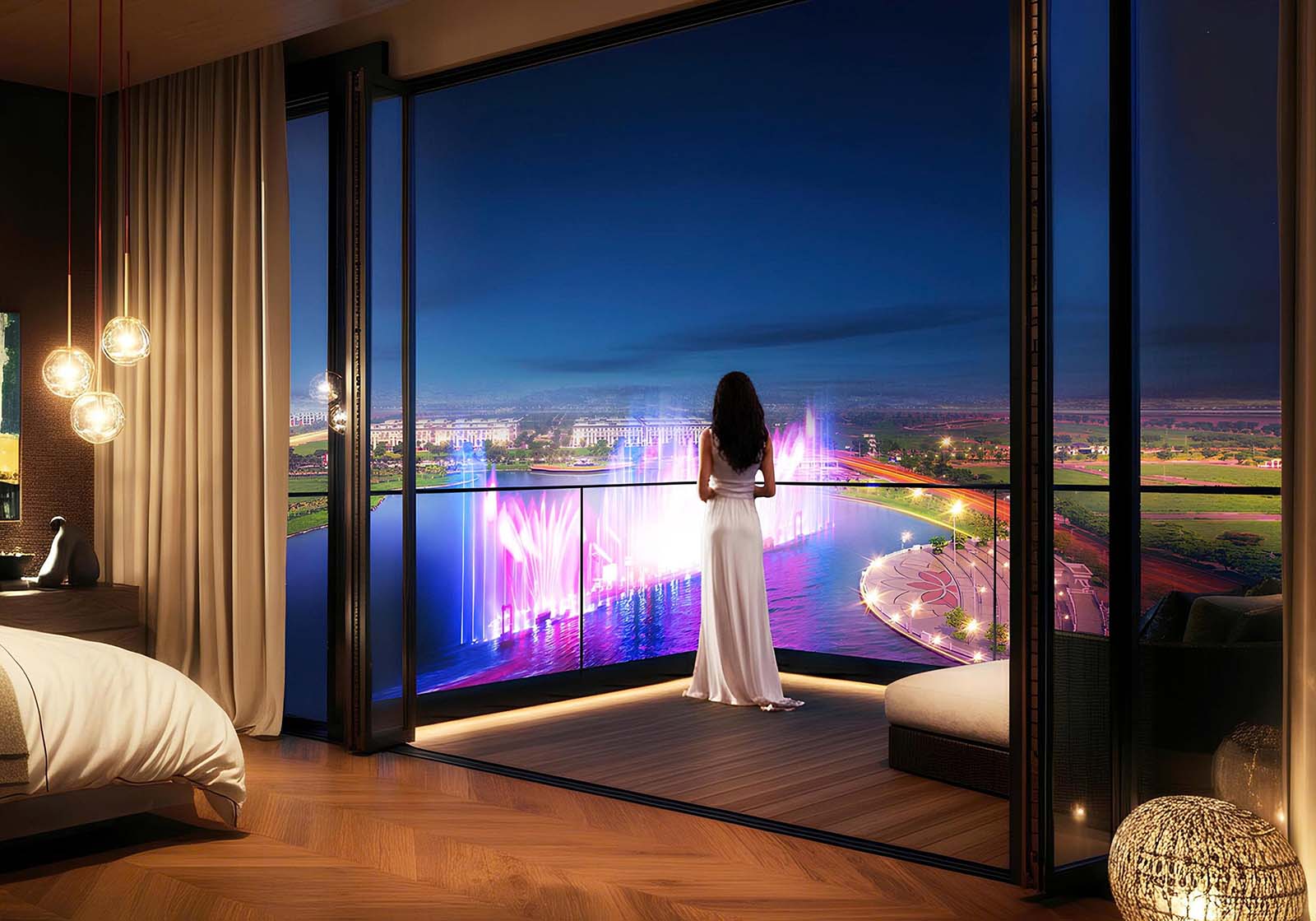 Thay vì phải di chuyển xa, chịu cảnh khói bụi hay xếp hàng giờ chờ đợi giữa đám đông, khách hàng chỉ cần bước ra hiên nhà, mở cửa ban công hoặc đơn giản là dạo bộ vài bước chân là đã có thể chiêm ngưỡng show trình diễn nhạc nước đẳng cấp khu vực. Hiên nhà bỗng chốc trở thành khán đài VIP nhất để có thể vừa nhâm nhi tách rượu vang thượng hạng, vừa thưởng thức những màn trình diễn nhạc nước đỉnh cao mà không bị ai làm phiền.