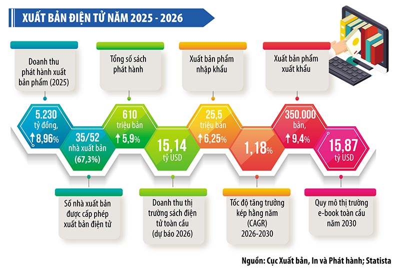 Chuyển đổi số tiếp tục được xác định là hướng đi quan trọng của ngành xuất bản trong năm qua. Đến hết năm 2025, 35/52 nhà xuất bản, chiếm 67,3%, đã được cấp xác nhận đăng ký hoạt động xuất bản, phát hành xuất bản phẩm điện tử. Con số này cho thấy nhận thức và hành động về xuất bản số đã có chuyển biến tích cực.