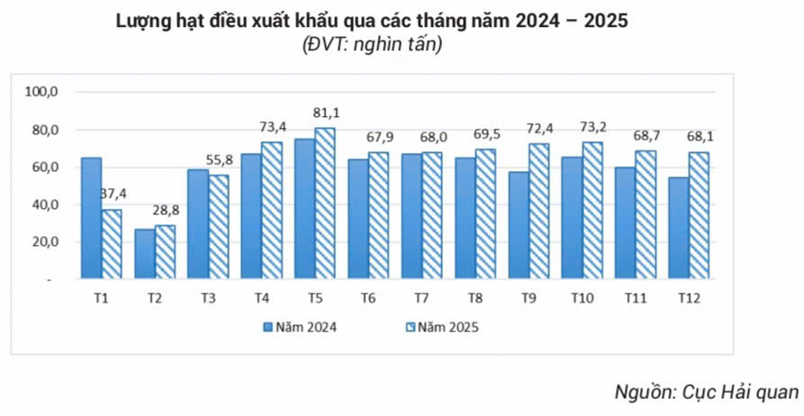 Theo số liệu của Cục Hải quan, xuất khẩu hạt điều tháng 12/2025 đạt 68.100 tấn, trị giá 465,6 triệu USD, tăng 25,4% về lượng và tăng 28,6% về trị giá so với cùng kỳ 2024. Tính chung cả năm 2025, xuất khẩu hạt điều nước ta đạt 766.500 tấn, trị giá 5,229 tỷ USD, chỉ tăng 5,7% về lượng nhưng lại tăng 20,4% về trị giá so với năm trước.