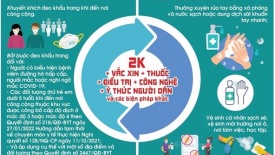 Thông điệp 2K phòng, chống dịch Covid-19 trong tình hình mớiTheo đó, thông điệp 5K được sửa đổi thành 2K gồm khẩu trang, khử khuẩn. Cùng với đó, Bộ Y tế cũng kêu gọi người dân tiêm vaccine Covid-19 đầy đủ và đúng lịch, kết hợp "thuốc + điều trị + công nghệ + ý thức" trong phòng chống dịch. -